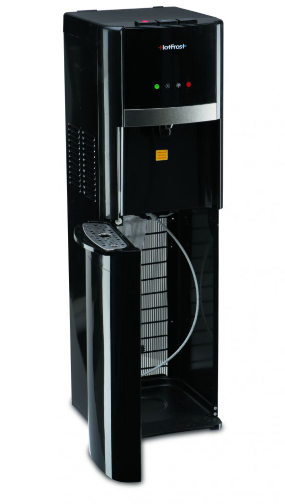 Строгий черный цвет и нижняя загрузка бутыли делает данный кулер особенно привлекательным, в любом помещении этот аппарат станет стильным дополнением интерьера. Кулер для воды HotFrost 40AN имеет классичсекий набор функций без особых излишек, нагрев и охлаждение воды, механическая защита от случайной подачи горячей воды, индикация пустой бутыли. Кулер имеет классическую схему охлаждения воды с применением компрессора. Основным преимуществом компрессорного охлаждения перед электронным является производительность, даже в жаркие летние дни в нем всегда будет холодная вода. Нагревательный элемент имеет очень экономичный расход электроэнергии, при этом не в ущерб производительности. Корпус кулера выполнен из пластика повышенной износостойкости. Решетка каплесборника и декоративная панель над аркой хромированные.