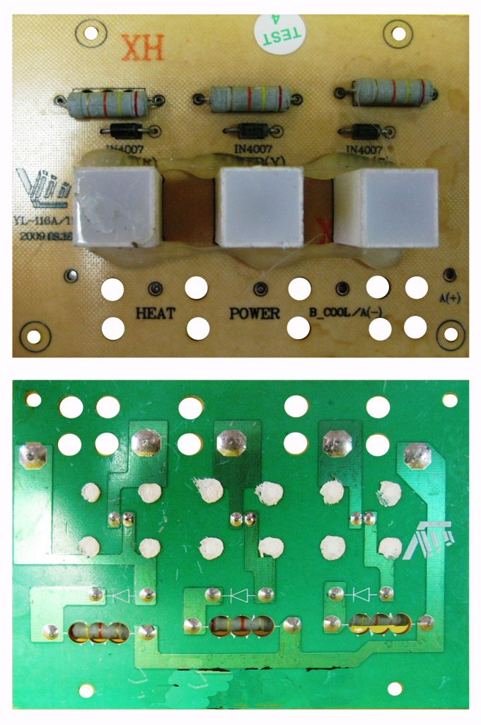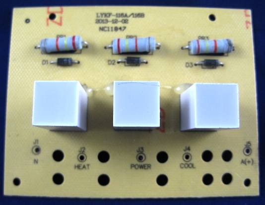 Плата индикации. Полупроводниковый прибор с электронно-дырочным переходом, создающий оптическое излучение при пропускании через него электрического тока. Расположен на лицевой панели аппарата. Служит для визуального информирования потребителя о режиме работы кулера в текущий момент времени. Когда кулер находится в режиме нагрева воды, горит красный светодиод, когда кулер нагрел воду заданной температуры и нагрев отключился , загорается желтый светодиод, а красный светодиод гаснет. Плата индикации представляет собой прямоугольную пластину с фольгированной медью с одной стороны, выполненную из стеклотекстолита. На фольгированной стороне проделаны необходимые токоведущие дорожки. На плате индикации установлены красный светодиод, желтый светодиод и электрокомпаненты, обеспечивающие работу светодиодов, а также разъем (или шлейф) для подключения к электрической схеме кулера.